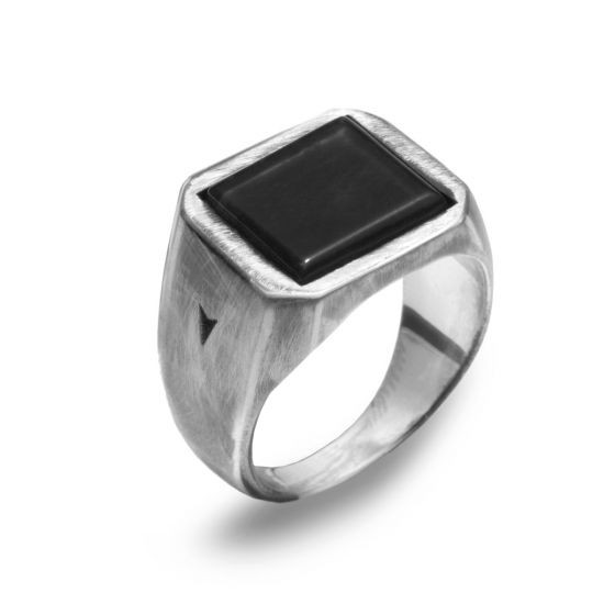 Anello in argento 925 a sigillo, il modello più classico del mondo della gioielleria maschile, qui arricchito da un onice naturale, con rodiatura nera, spazzolaturae sfaccettature eseguite a mano, ognuno in pezzo unico, inimitabile. Un vero e proprio stemma di Fonderia prodotto in Italia.
