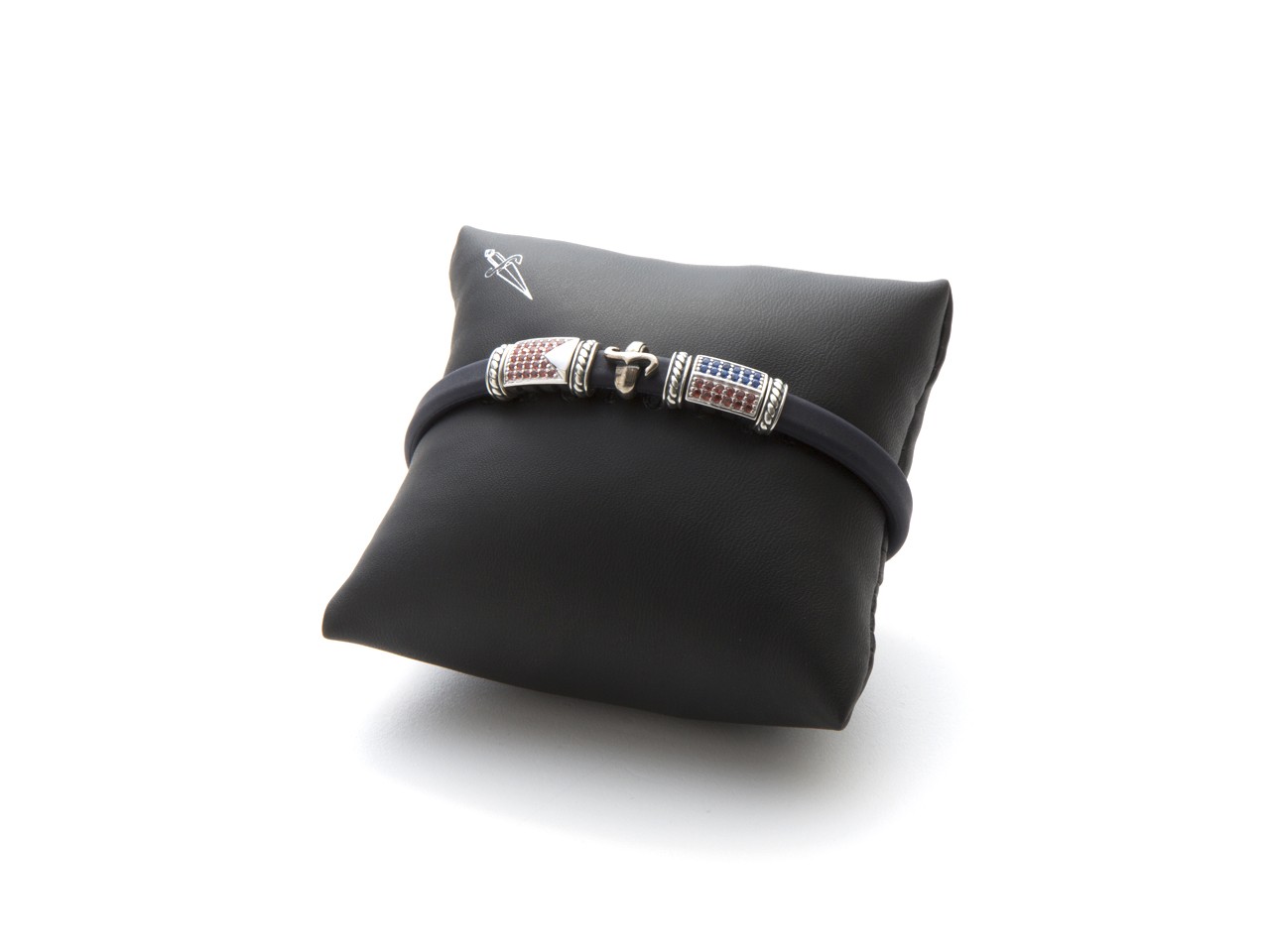 Cesare Paciotti, Bracciale in silicone blue, pugnale centrale, simboli nautici ed anelli decorati