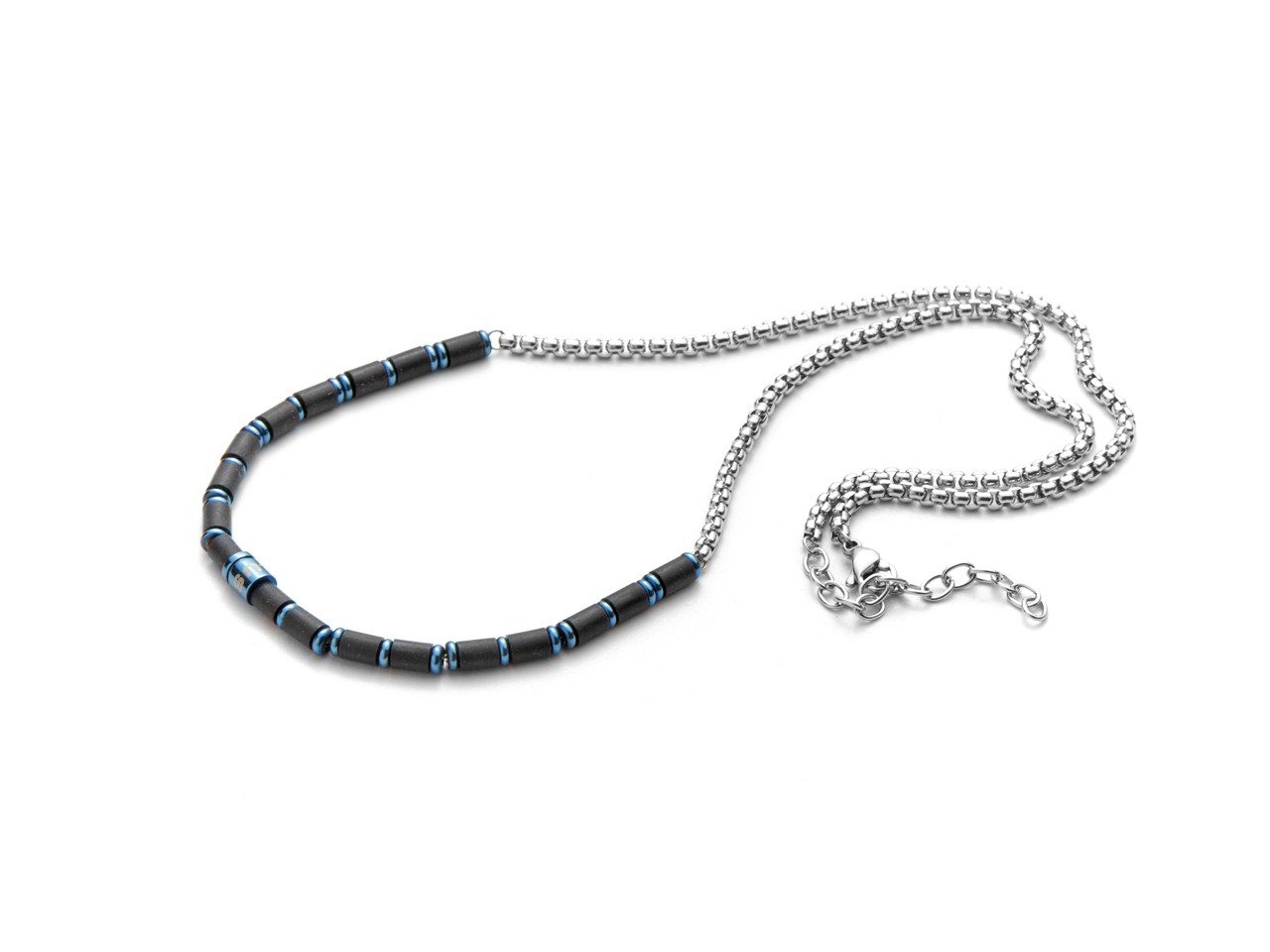 Collana in acciaio blu e gomma nera.