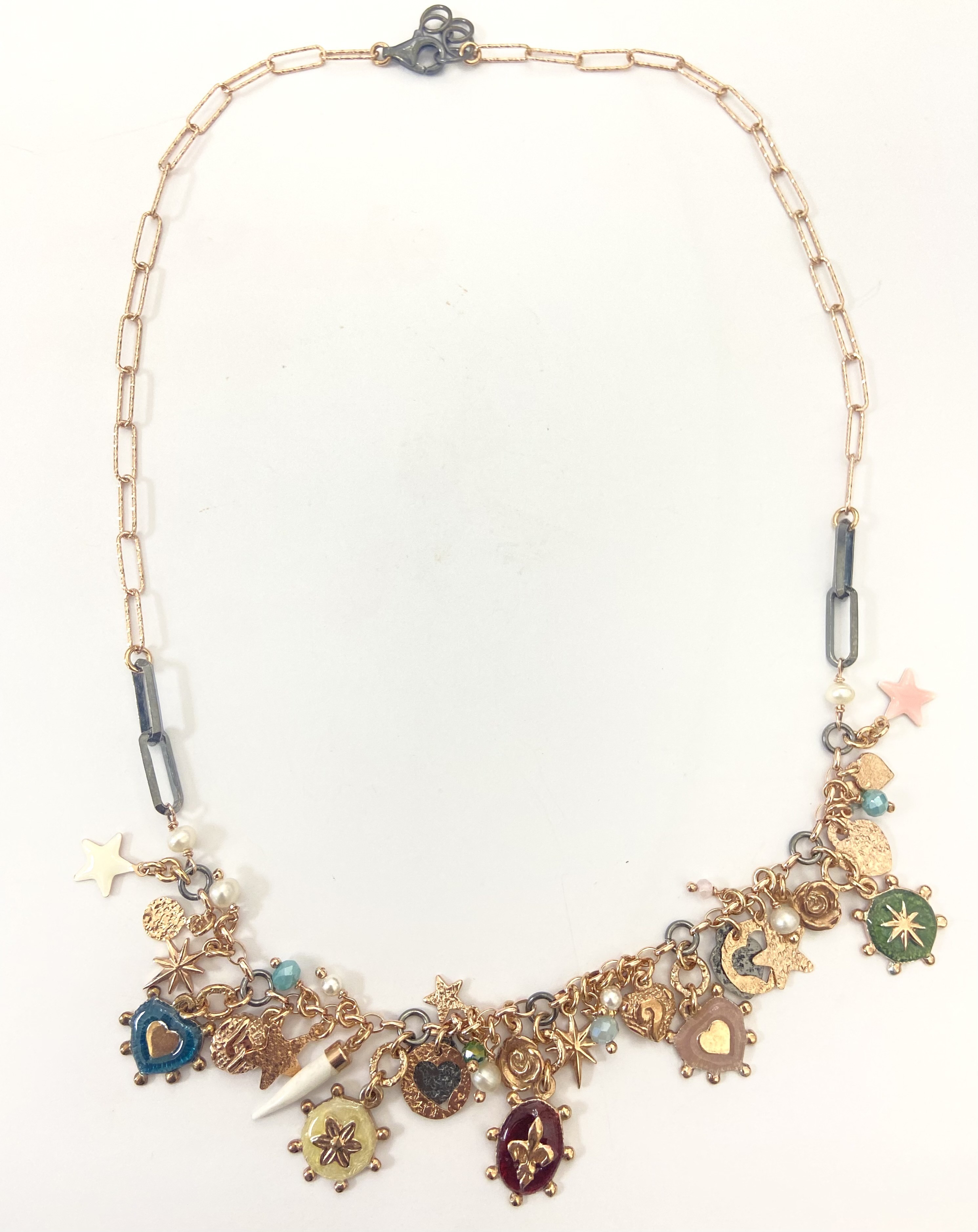 Collana lunga in Argento 925 rosa, inserti bruniti, perle, cristalli e ciondoli in smaltature colorate.