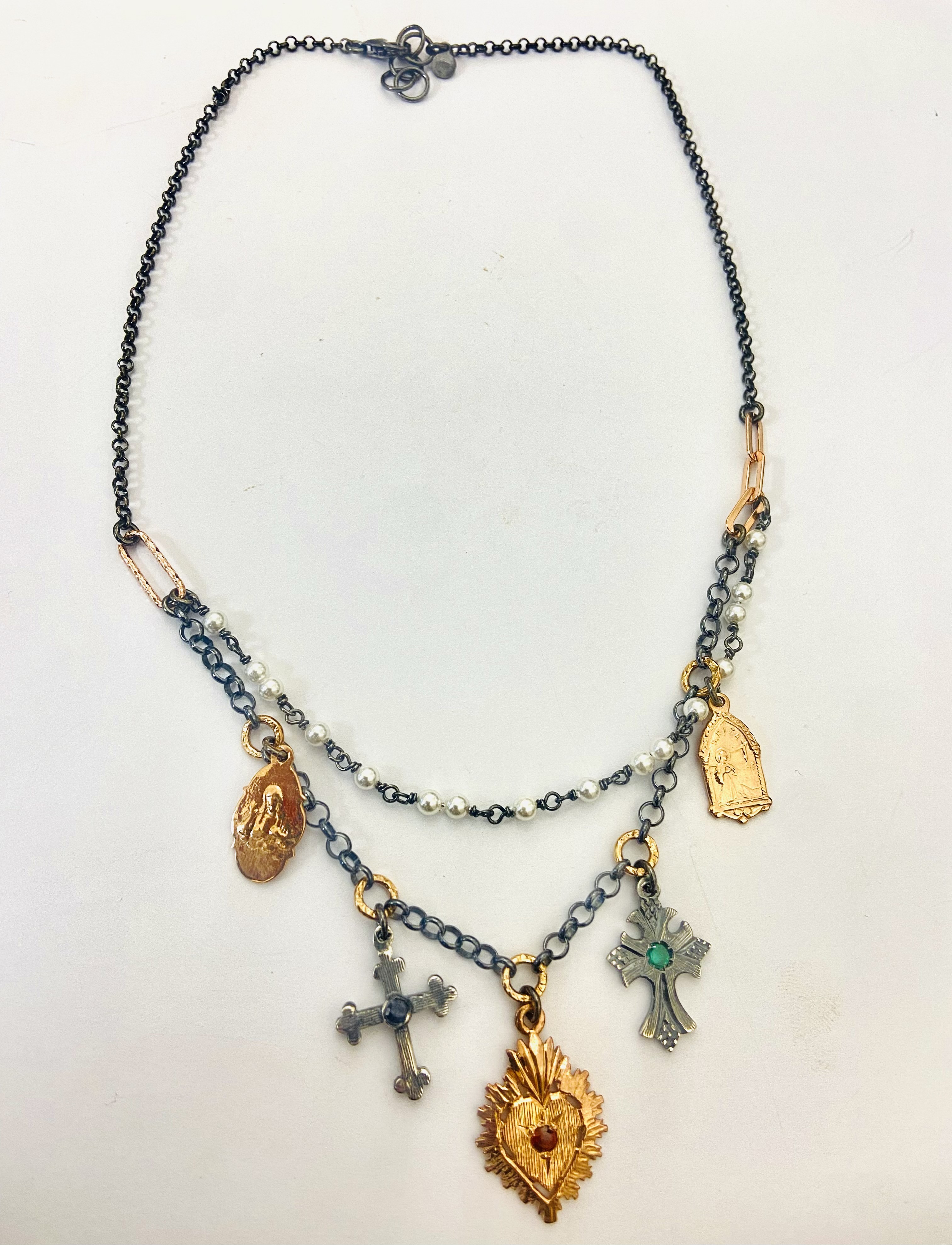 Collana lunga in Argento 925 nero, inserti rosa, perle, medaglie sacre, rubino zaffiro e smeraldo.