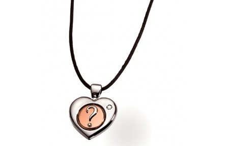 Girocollo in cordino black con pendente cuore: esterno in acciaio e diamante, interno in acciaio rosè con "?" punto interrogativo, interno girabile.