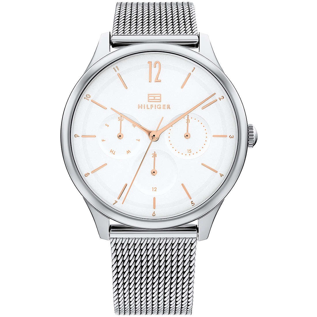 Orologio cronografo da donna della collezione layla di Tommy Hilfiger. Orologio cronografo con cassa rotonda di dimensione 38mm di colore argento realizzata in acciaio argentato. Il quadrante è di colore bianco. Il vetro è minerale. Il cinturino è in acciaio maglia mesh di colore argento. Funzioni: multifunzione. La resistenza all'acqua è di 3 atm.