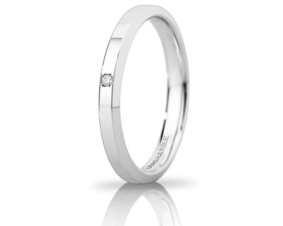 Fede nuziale "Hydra Slim" in oro 750 e diamante centrale di taglio brillante ct. 0,01. Mm 3,00 "Hydra Slim" è un anello dalla linea moderna e squadrata, impreziosito da un diamante centrale che lo rende luminoso come la costellazione dalla quale prende il nome.