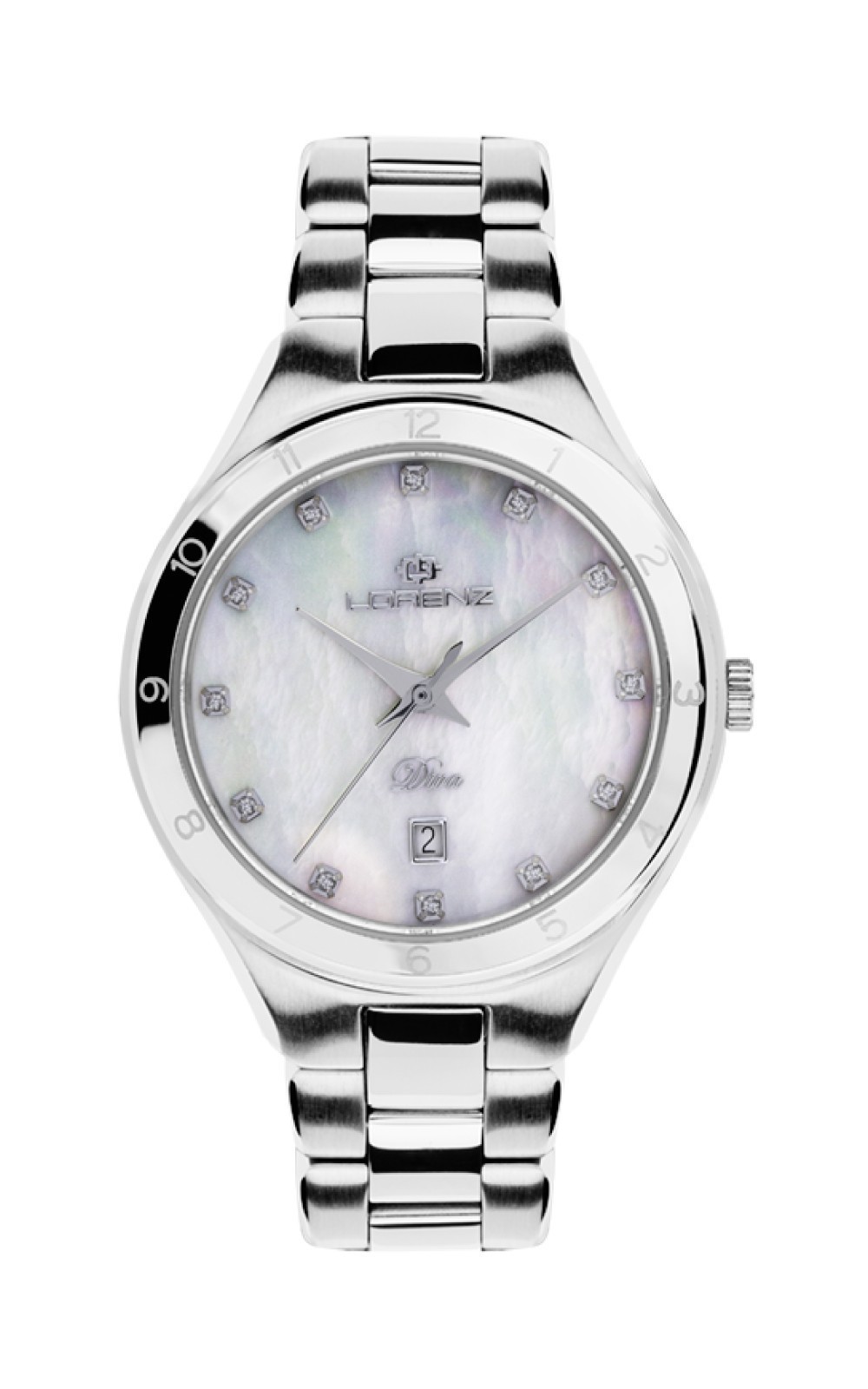 Orologio da donna solo tempo. Cassa rotonda in acciaio diametro 32 mm. con fondello fissato con 4 viti e vetro zaffiro. Cinturino in acciaio e chiusura a farfalla. Movimento al quarzo Ronda 765. Resistente all'acqua fino a 5 atmosfere.