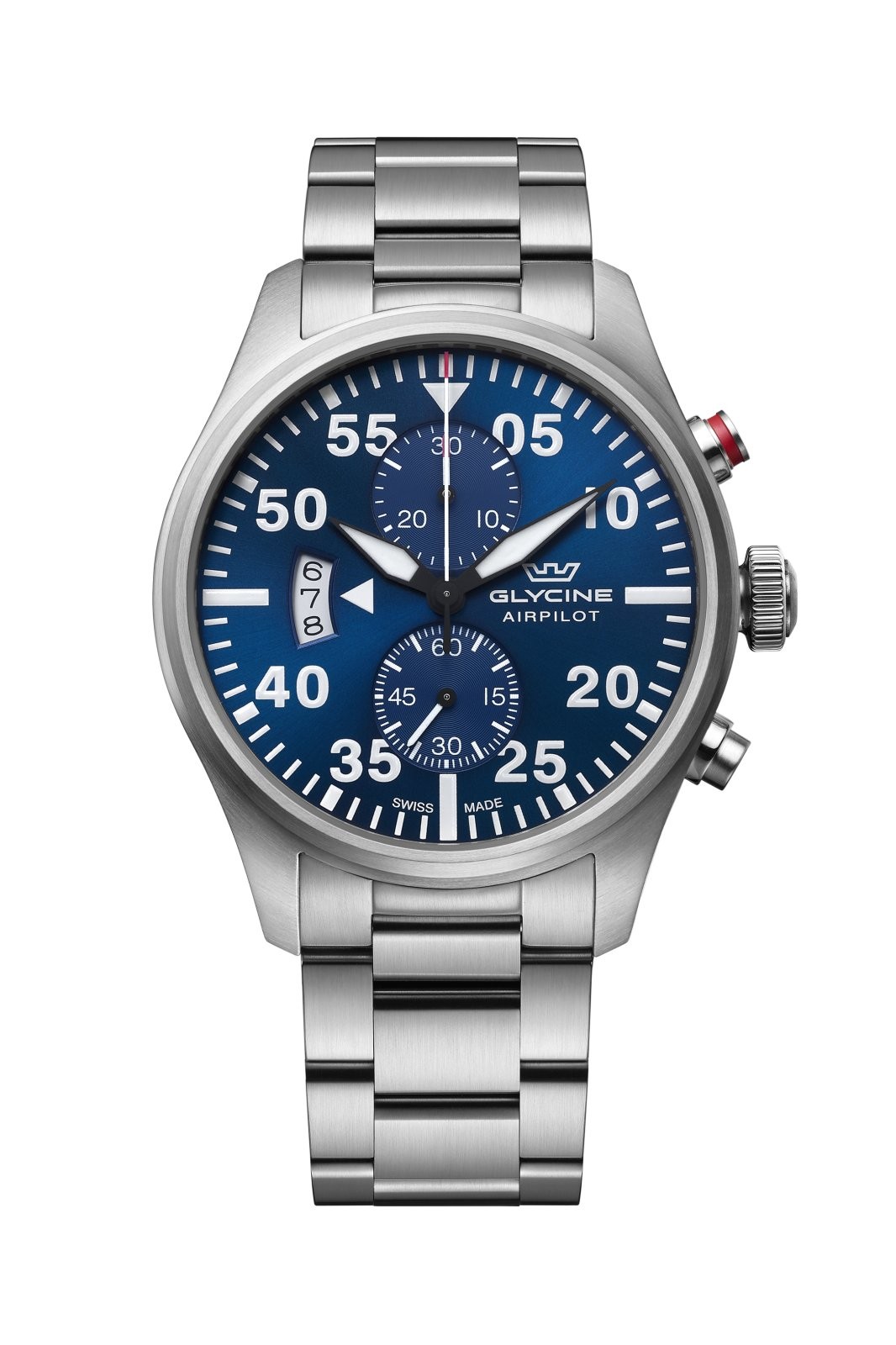 Glycine GL0354 ha una cassa in acciaio inossidabile da 44 millimetri con quadrante blu.