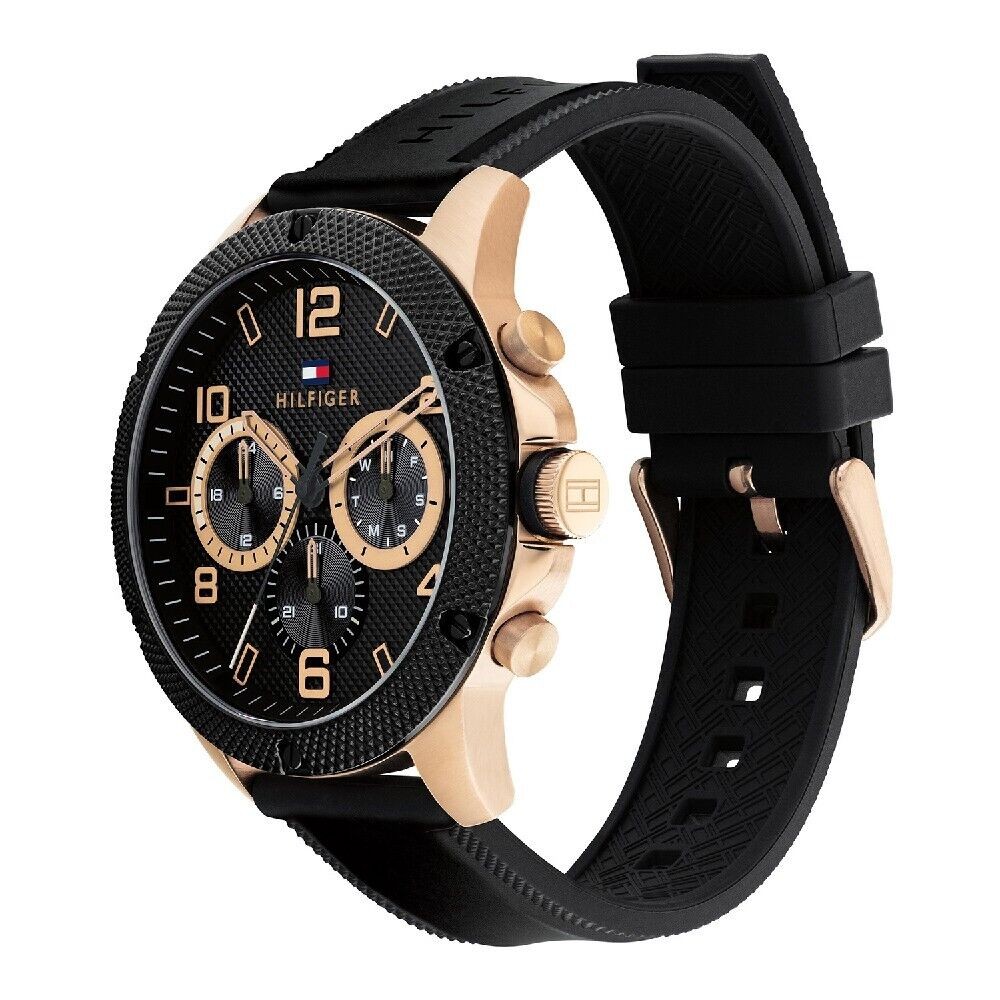 Orologio multifunzione da uomo di Tommy Hilfiger della collezione blaze. Il quadrante è di colore nero con vetro minarale. La cassa è tonda con diametro di 46mm di colore nero/oro rosa e realizzata in acciaio anallergico. Orologio con cinturino in silicone di colore nero. La resistenza all'acqua è di 5 atm.