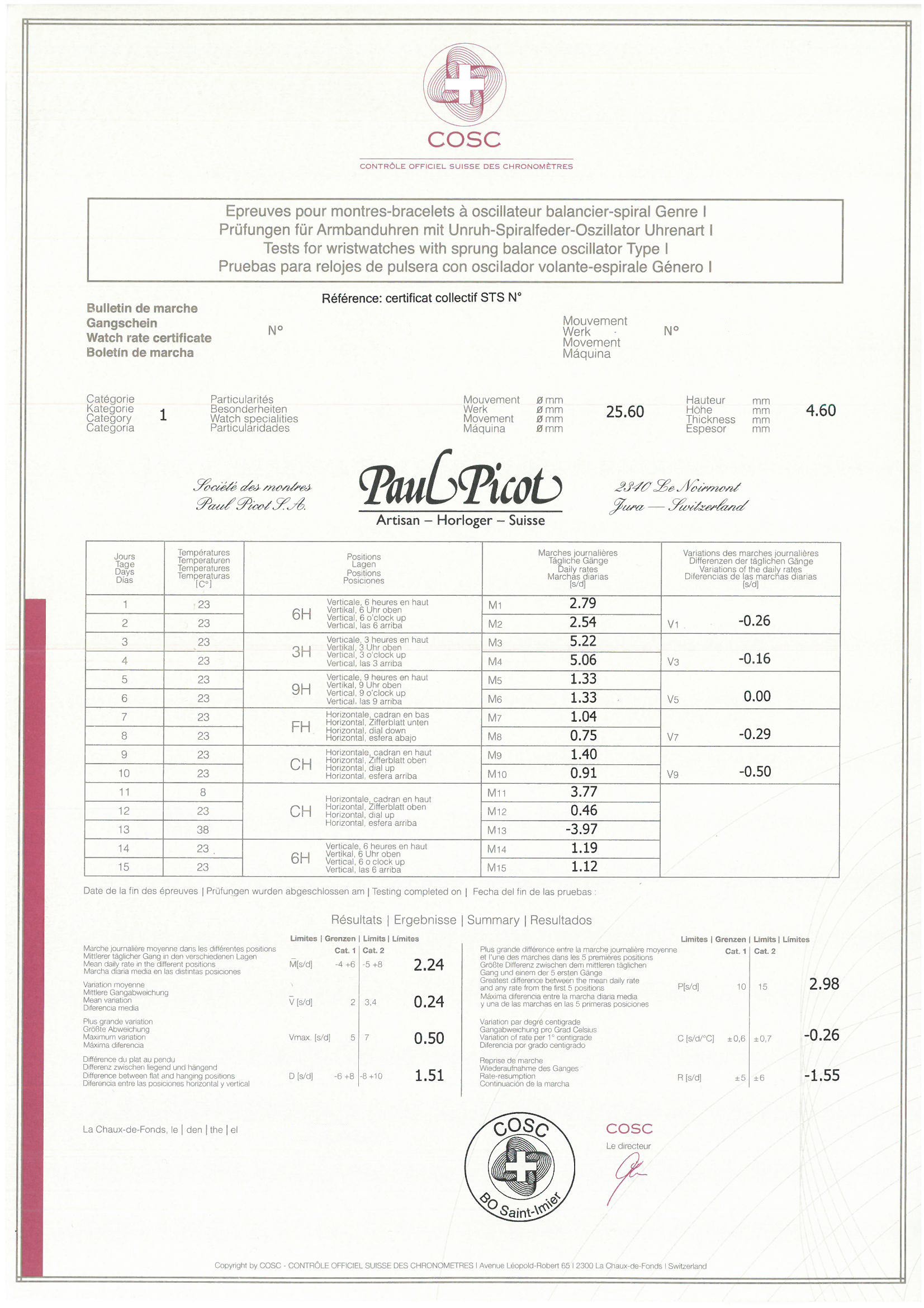 Ogni cronometro ufficialmente certificato COSC è identificato da un numero di serie inciso sul movimento e da un numero di certificazione assegnato dal COSC. Ogni movimento senza cassa viene testato individualmente per quindici giorni, in cinque posizioni, a tre diverse temperature. I movimenti sono dotati di lancetta dei secondi e i meccanismi di carica automatica sono disinseriti per i test. Le misurazioni vengono effettuate quotidianamente con l'ausilio di telecamere. Sulla base di queste misurazioni, vengono calcolati sette criteri eliminatori, ciascuno dei quali deve essere soddisfatto. Il protocollo di test richiede l'avvolgimento quotidiano esattamente alla stessa ora ogni giorno. Ogni anno vengono consegnati oltre un milione di certificati cronometrici ufficiali, che rappresentano solo il 3% della produzione orologiera svizzera. Per ottenere la certificazione di cronometro, un movimento non solo deve essere realizzato con componenti della massima qualità, ma deve anche essere oggetto di particolare cura da parte dei migliori orologiai e cronometristi durante l'assemblaggio. Degli orologi meccanici fabbricati in Svizzera, circa il 5% è certificato come cronometro dal COSC.