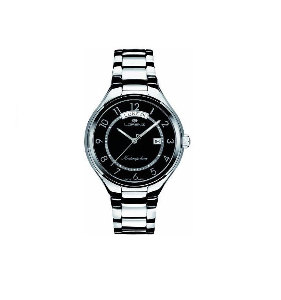 Orologio uomo solo tempo con movimento a quarzo (Swiss Made), calendario, cinturino in acciaio e cassa rotonda collezione Montenapoleone Lorenz. L'orologio Lorenz si presenta con cinturino in acciaio e chiusura a deploiante con palsanti laterali di sicurezza. Il quadrante è di colore nero con calendario posizionato a ore 12 e datario posizionato a ore 3. Gli indici a numeri arabi sono di colore argento mentre la lancette a bastone sono di colore argento/ bianco. L'orologio è impermeabile all'acqua fino a 5 Atm (50 Metri). Il prodotto verrà consegnato nella sua scatola originale compreso di garanzia ufficiale Lorenz 24 mesi.