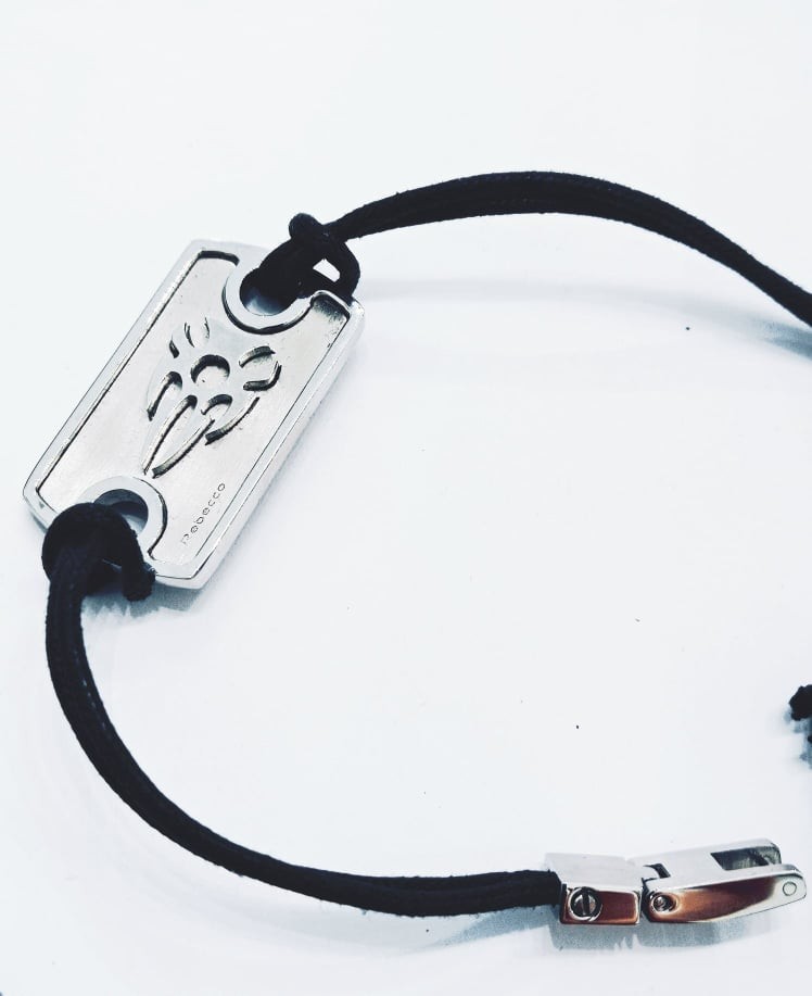 Piastra centrale in acciaio anallergico con "Tribale" e cordino doppio nero con chiusura a maglie in acciaio.