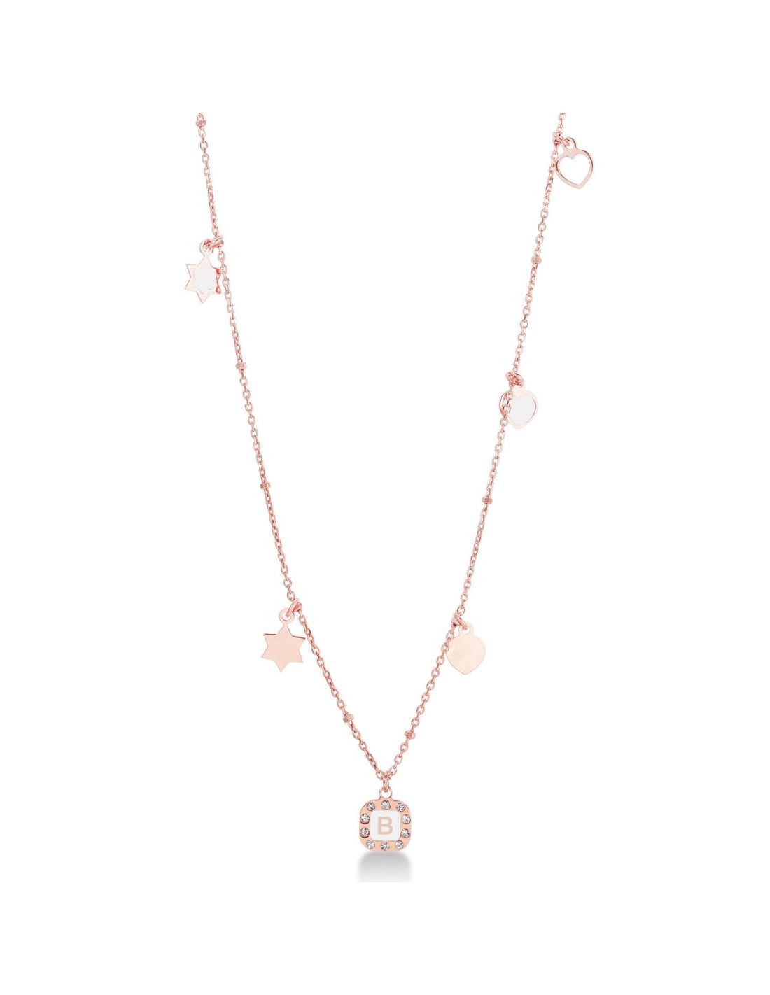 Girocollo lunghezza 45 cm colore rosa in bronzo placcato oro rosa 24kt con iniziale pendente su smalto bianco e charms cuori e stelle.
