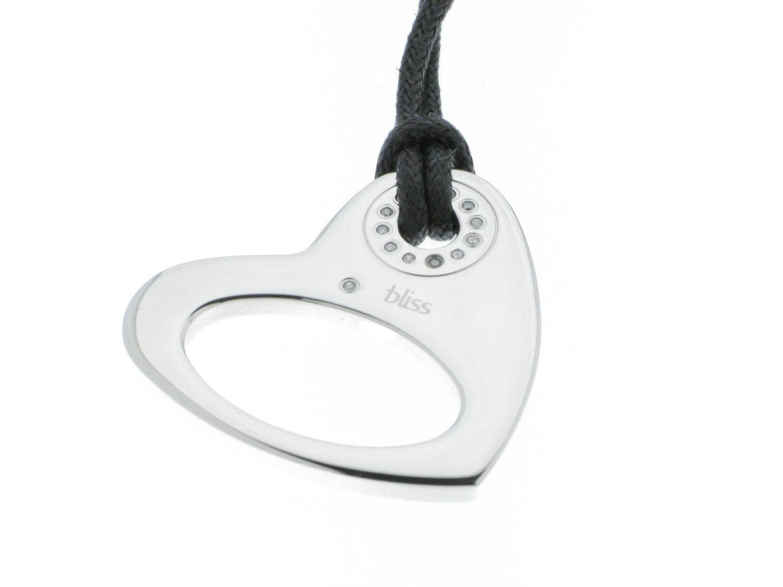 BLISS COLLANA MODELLO SHAPE CUORE IN ACCIAIO FORATO LUCIDO CON 13 DIAMANTI TAGLIO BRILLANTE CT. 0.13 totali, CORDINO NERO CON CHIUSURA IN ACCIAIO A PRESSIONE. LUNGHEZZA CORDINO cm. 42; LUNGHEZZA CUORE 36,60mm X LARGHEZZA 36,85mm X SPESSORE 2,60mm.