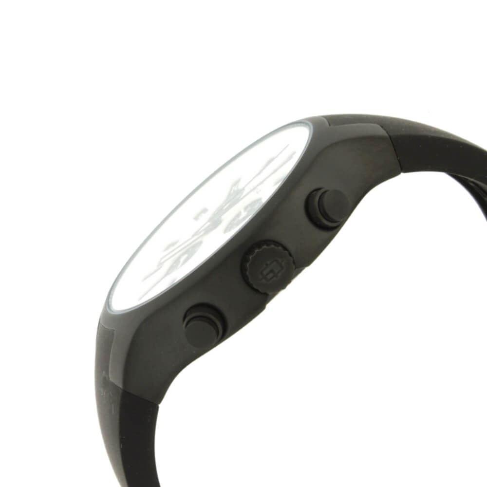 Cinturino morbido in silicone nero con cassa in acciaio pvd black, quadrante bianco.