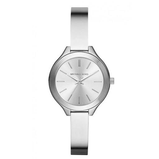 Quadrante color argento con indici a bastone, tre lancette e logo Michael Kors