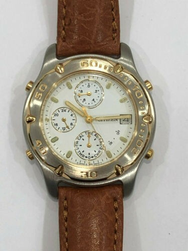 Cassa in acciaio satinato con ghiera bicolore, cinturino in pelle marrone.