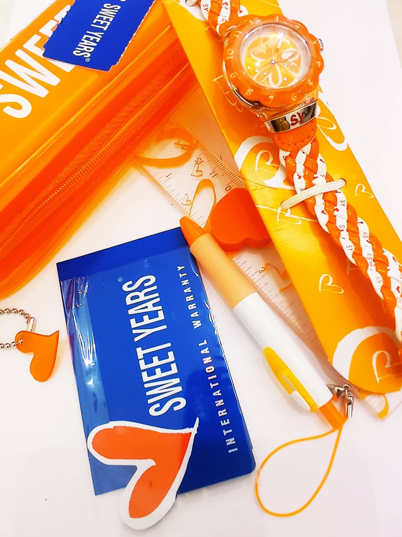 Orologio munito di astuccio arancione Sweet Years con righello, gomma rossa a forma di cuore e penna gadget.