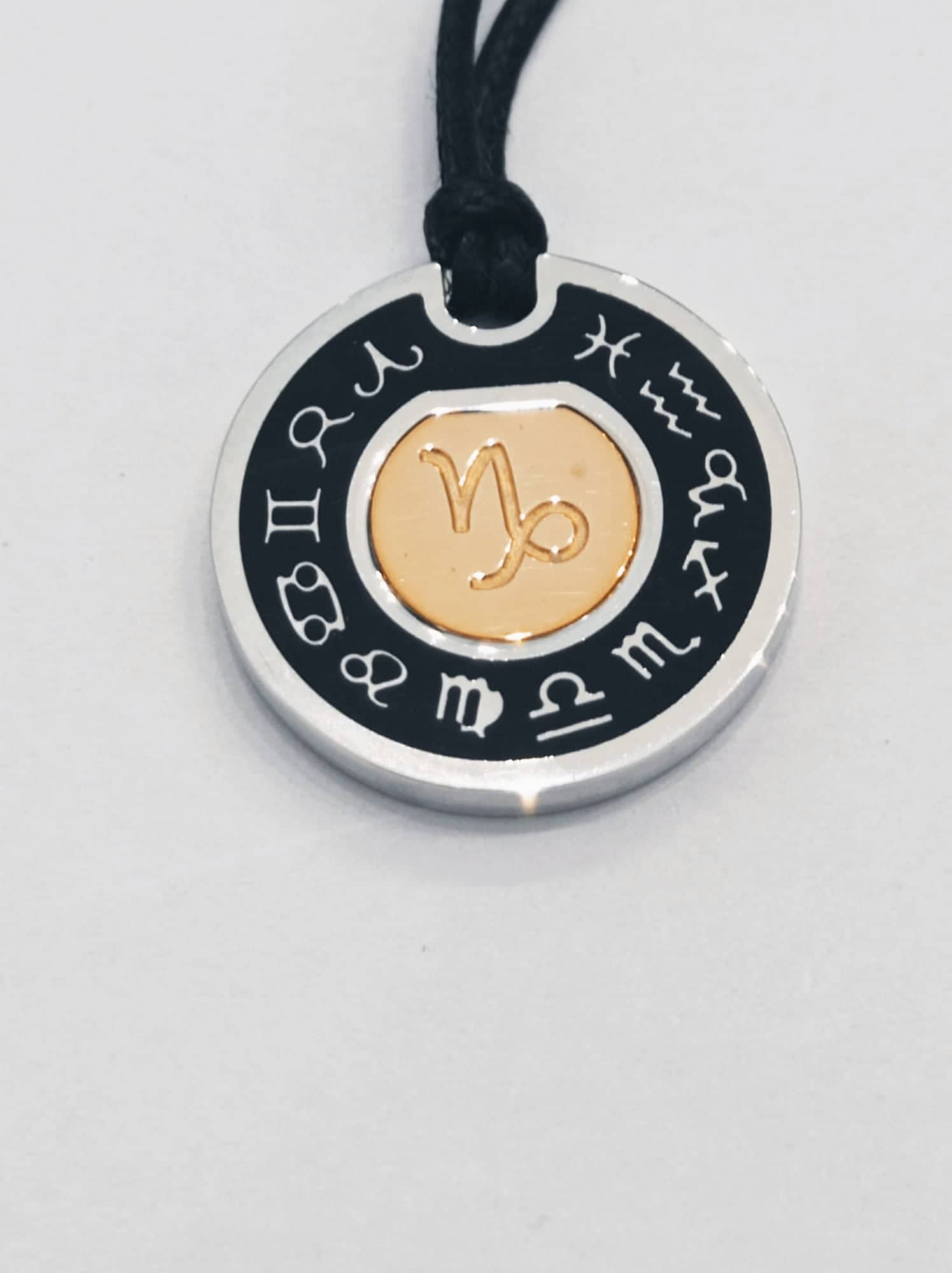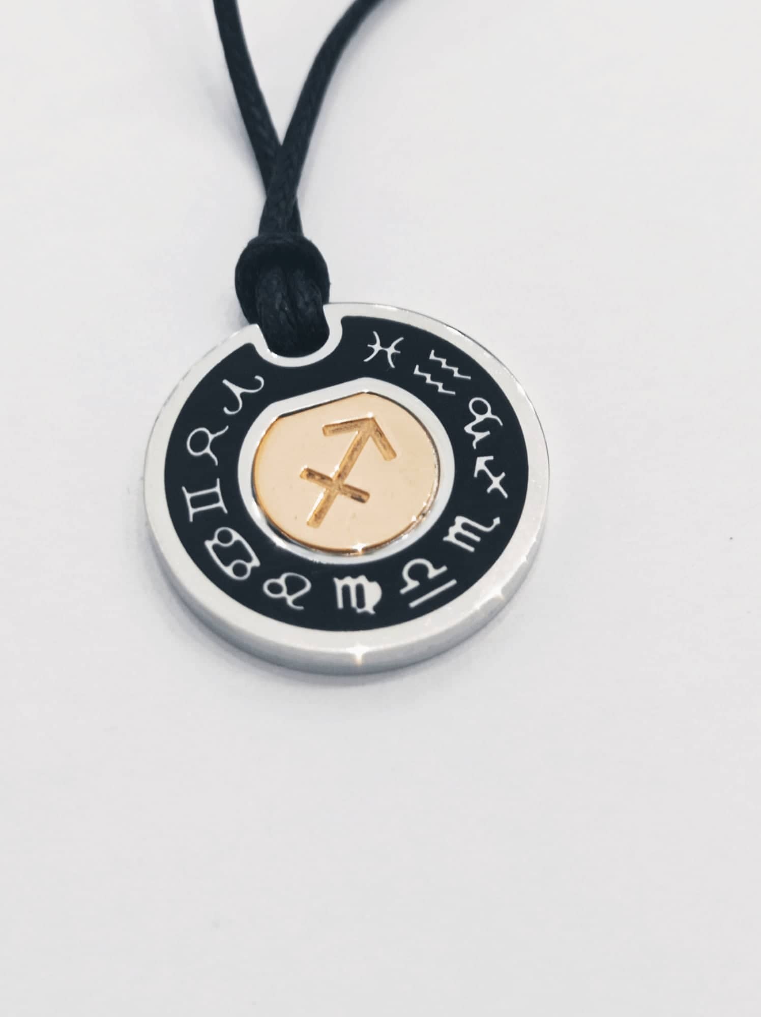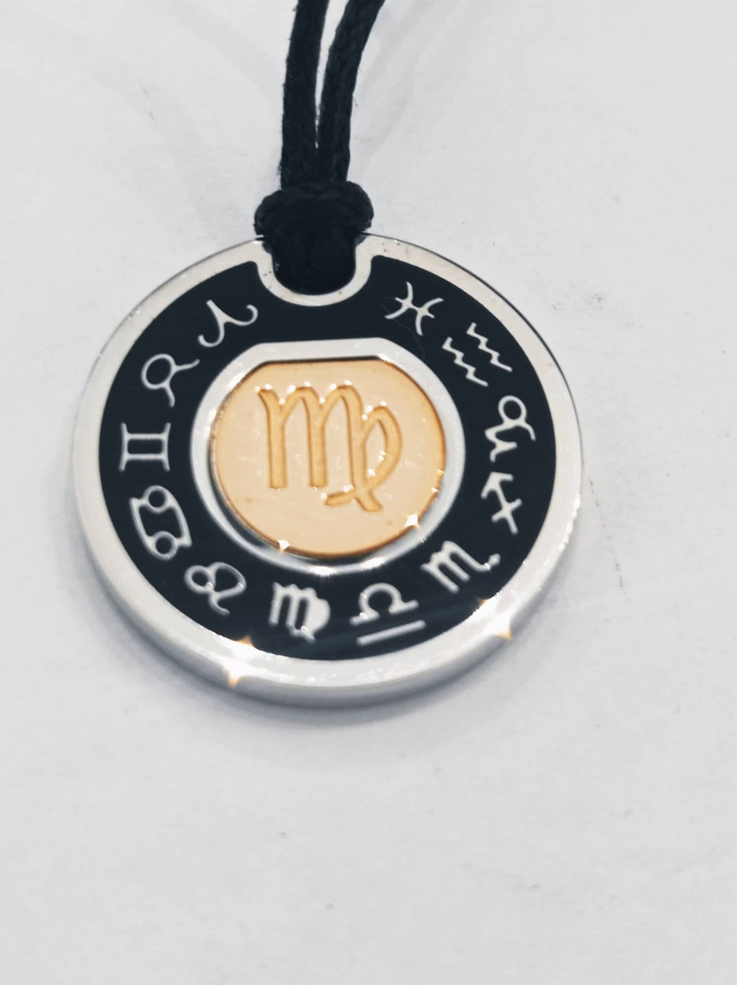 Segno zodiacale in argento 925 e oro rosa, compreso di cordino nero regolabile con nodi.