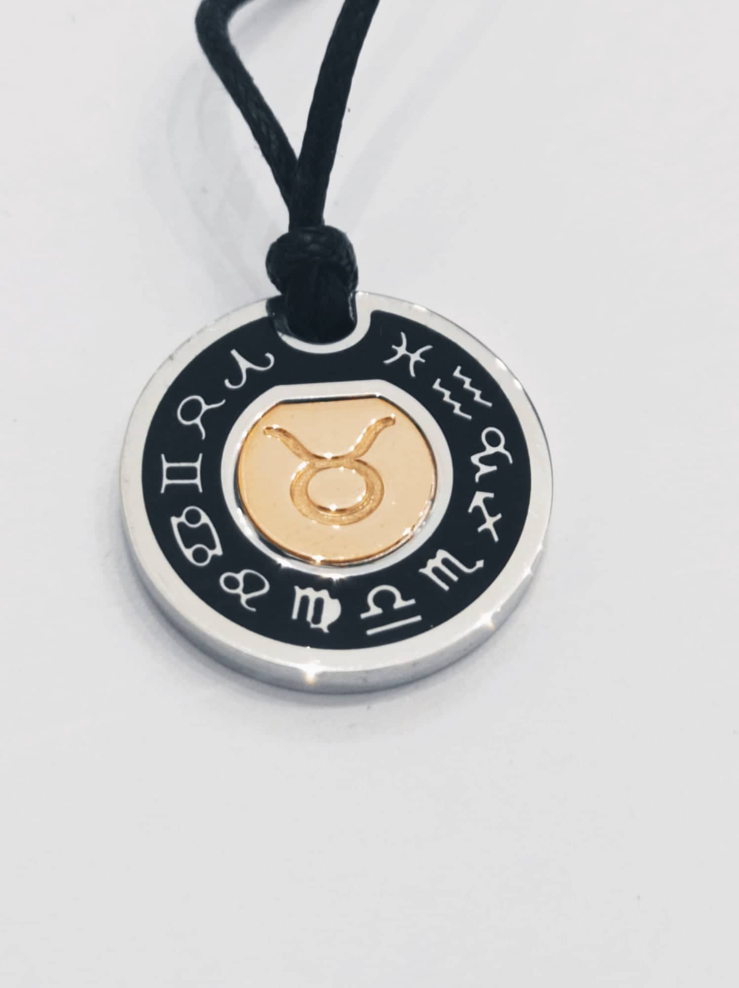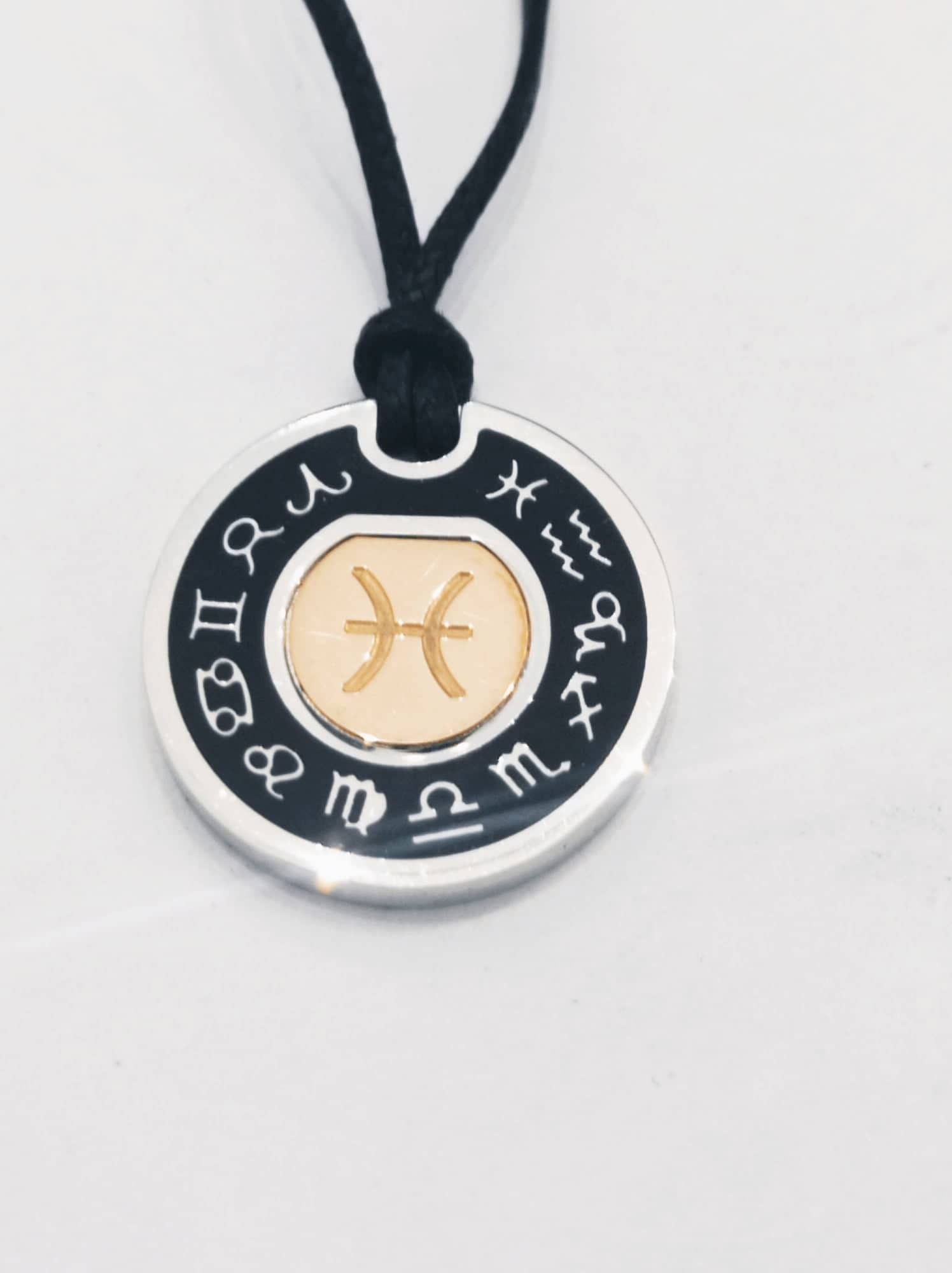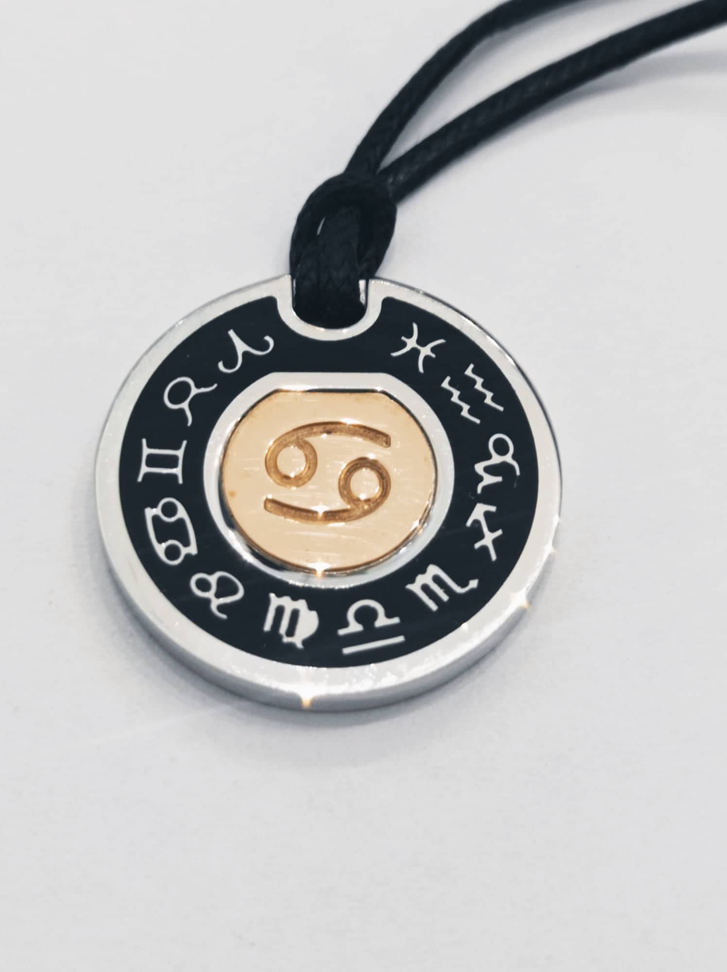 Segno zodiacale in argento 925 e oro rosa, compreso di cordino nero regolabile con nodi.