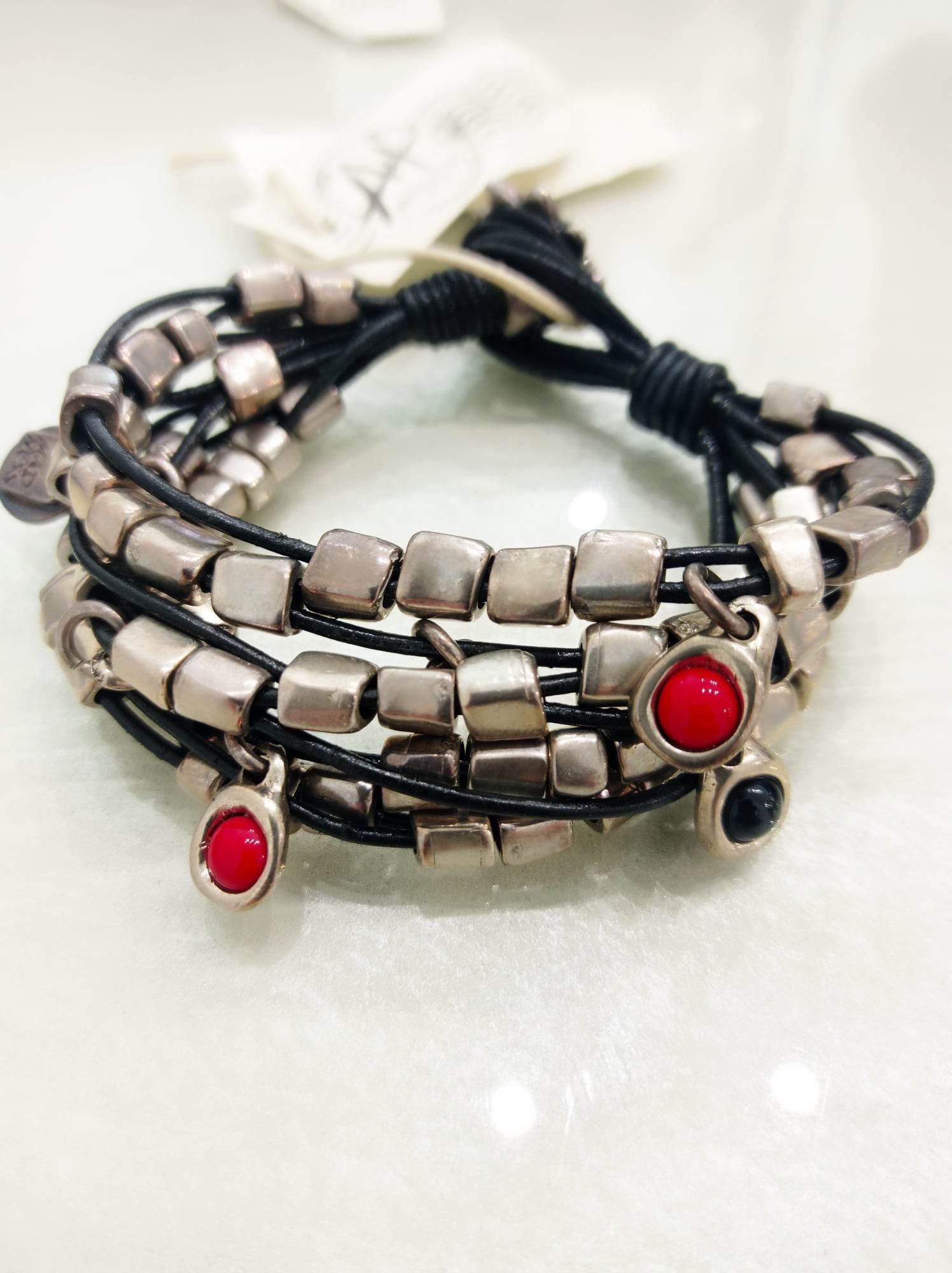 Bracciale Madness multifilo in pelle con elementi rivestiti in argento brunito 925/°°° e pietre.