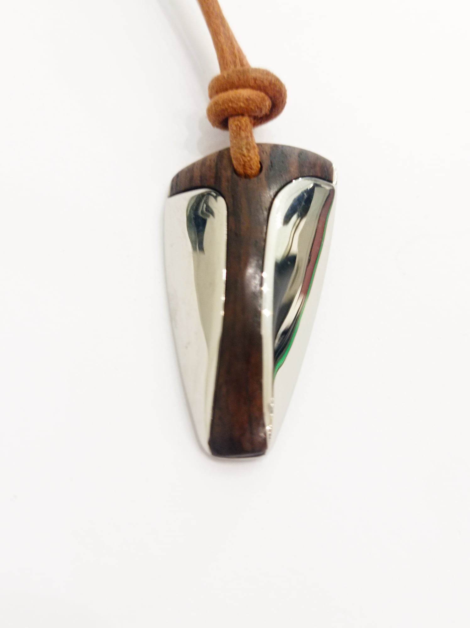 Pendente a forma di corno stilizzato tribale in legno e acciaio. cm 1,8 x cm 3,2 circa.