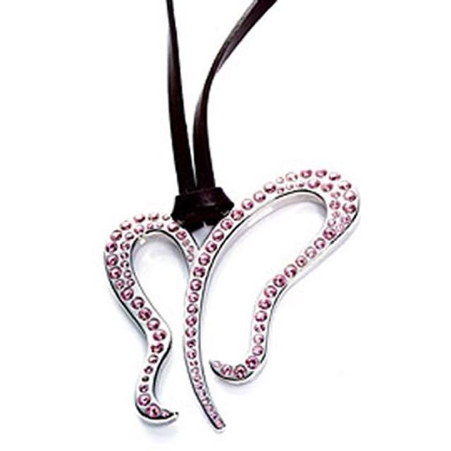 Pendente a forma di farfalla stilizzata in acciaio lucido e cristalli rosa. cm 4 x cm 5 circa.