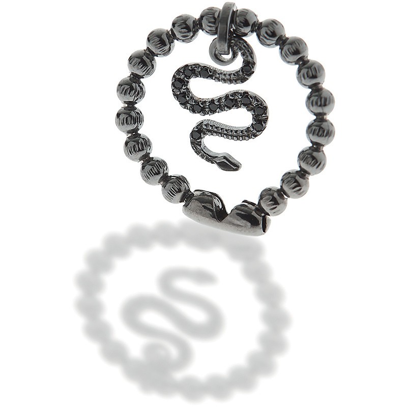 Anello Jack&Co in argento925 brunito a palline sfaccettate con ciondolo serpente 1,5 cm con zirconi Neri.