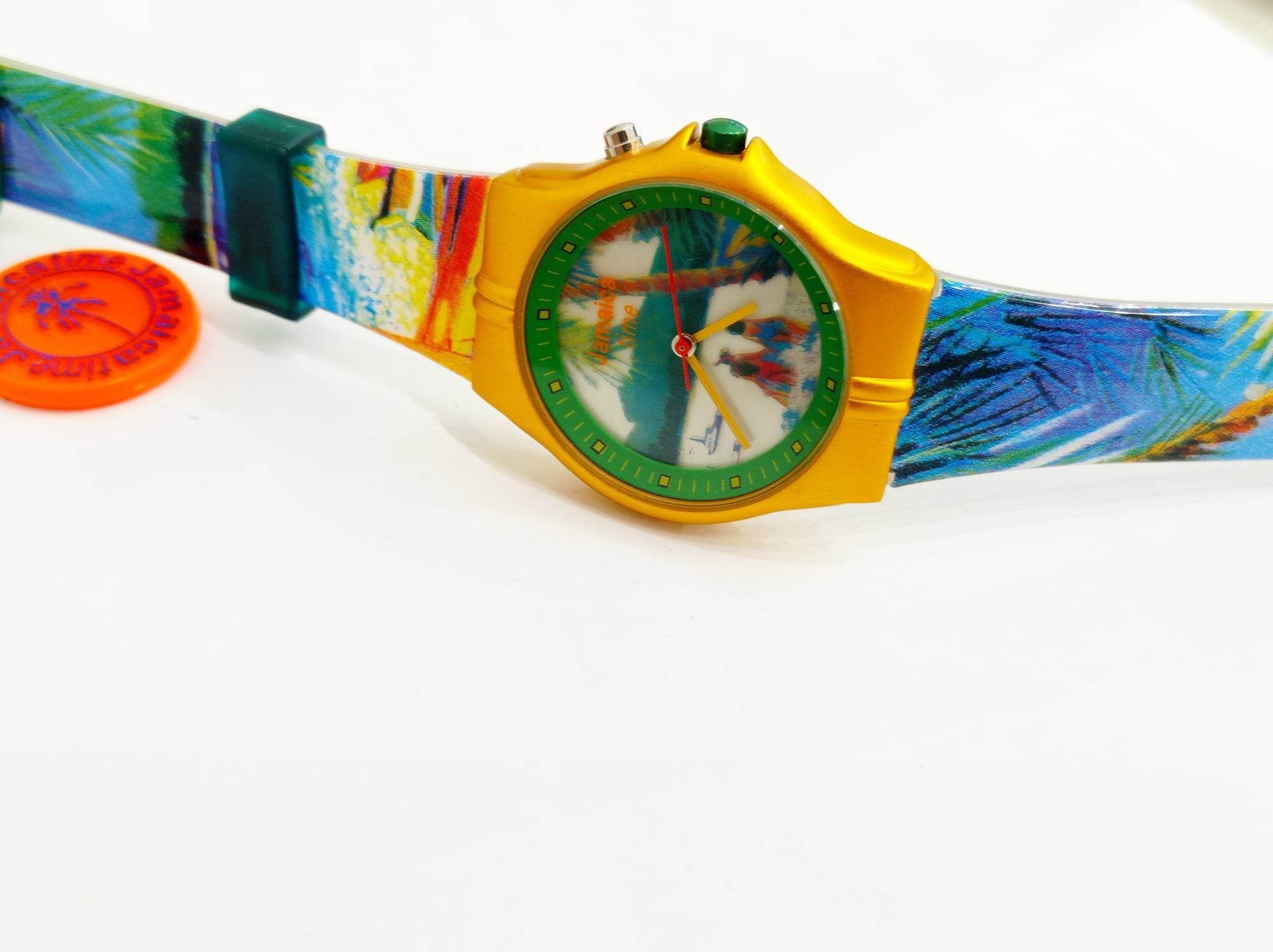 Orologio Jamaica Time movimento al quarzo, cassa in acciaio color oro metallizzato, quadrante con immagine fantasia, vetro minerale, corona a vite, cinturino plastica fantasia multicolore.