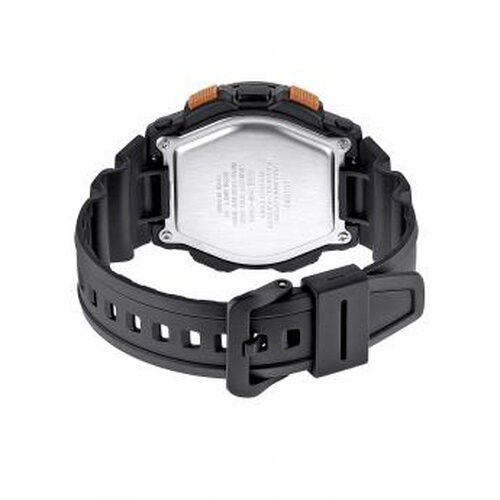 Orologio da uomo Casio. Cassa e cinturino in resina nera. Lunetta grigia e quadrante nero. Indici bianchi luminescenti. Bussola. Indicatore delle fasi lunari. Calendario digitale. Termometro. Funzione tempo universale. Cronometro. Timer. 5 allarmi. Cristallo minerale. Quarzo. 100m.