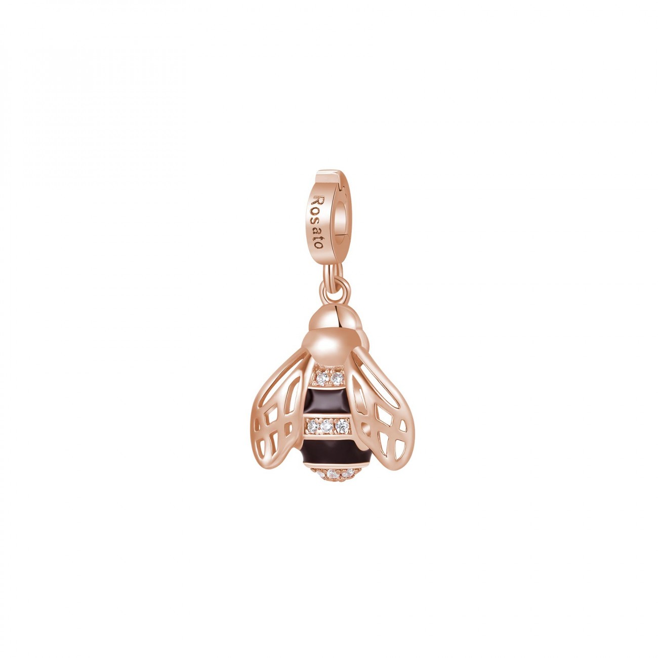 Charm in argento 925‰ e placcatura oro rosa a forma di ape con smalto nero e 32 cubic zirconia bianchi.