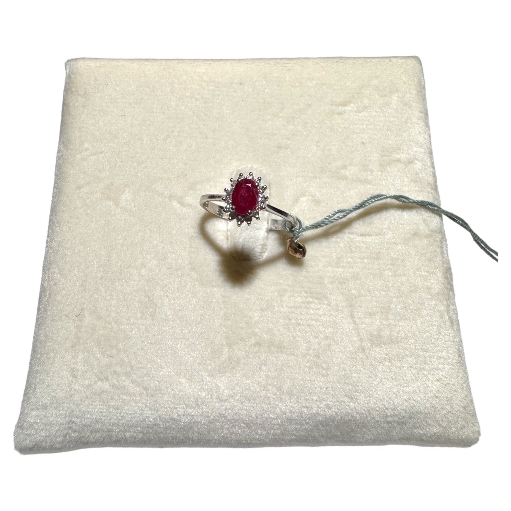 Anello in oro bianco 18KT con rubino naturale taglio ovale CT 0,76 e diamanti naturali CT0,16 G VS