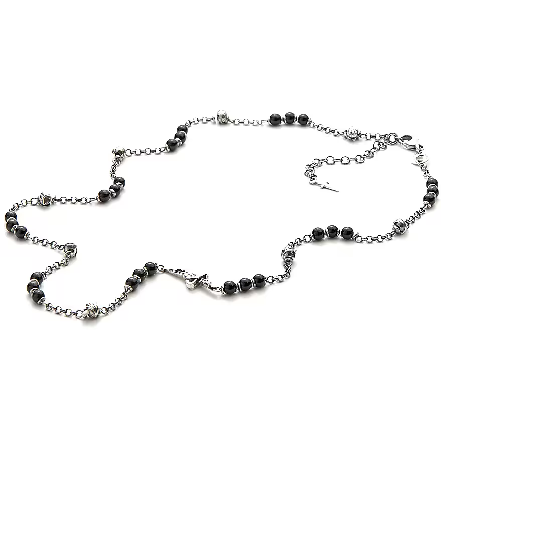 Collana Da Uomo Di Cesare Paciotti Della Collezione Black Matte. Gioiello Vintage Realizzato In Argento Con Onice Di Colore Nero. Collana Rosario Con Sfere In Onice Nero E Sfere In Argento Con Chiusura A Pappagallo. Lunghezza: 50 Cm Più 5 Cm Di Riduzione.