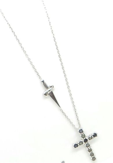 COLLANA IN ARGENTO 925/°°° LUCIDA E RODIATA CON CATENINA A LAVORAZIONE ROLLO DI CM 49, CON POSSIBILITA DI REGOLARE LA MISURA . PENDENTE CENTRALE CROCETTA DI MM 17 X 13 INCASSATI ZIRCONI NERI.SPADINA LATERALE . LOGO SULLA CHIUSURA