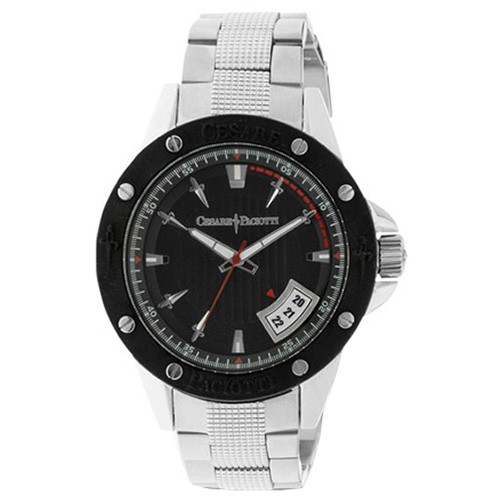 Orologio da polso solo con movimento al quarzo, datario, vetro minerale antiriflesso, cassa in acciaio 44 mm, cinturino in acciaio, quadrante nero, indici con logo di Cesare Paciotti, resistenza all'acqua 50 metri , lunetta in gomma nera, corona acciaio a vite.