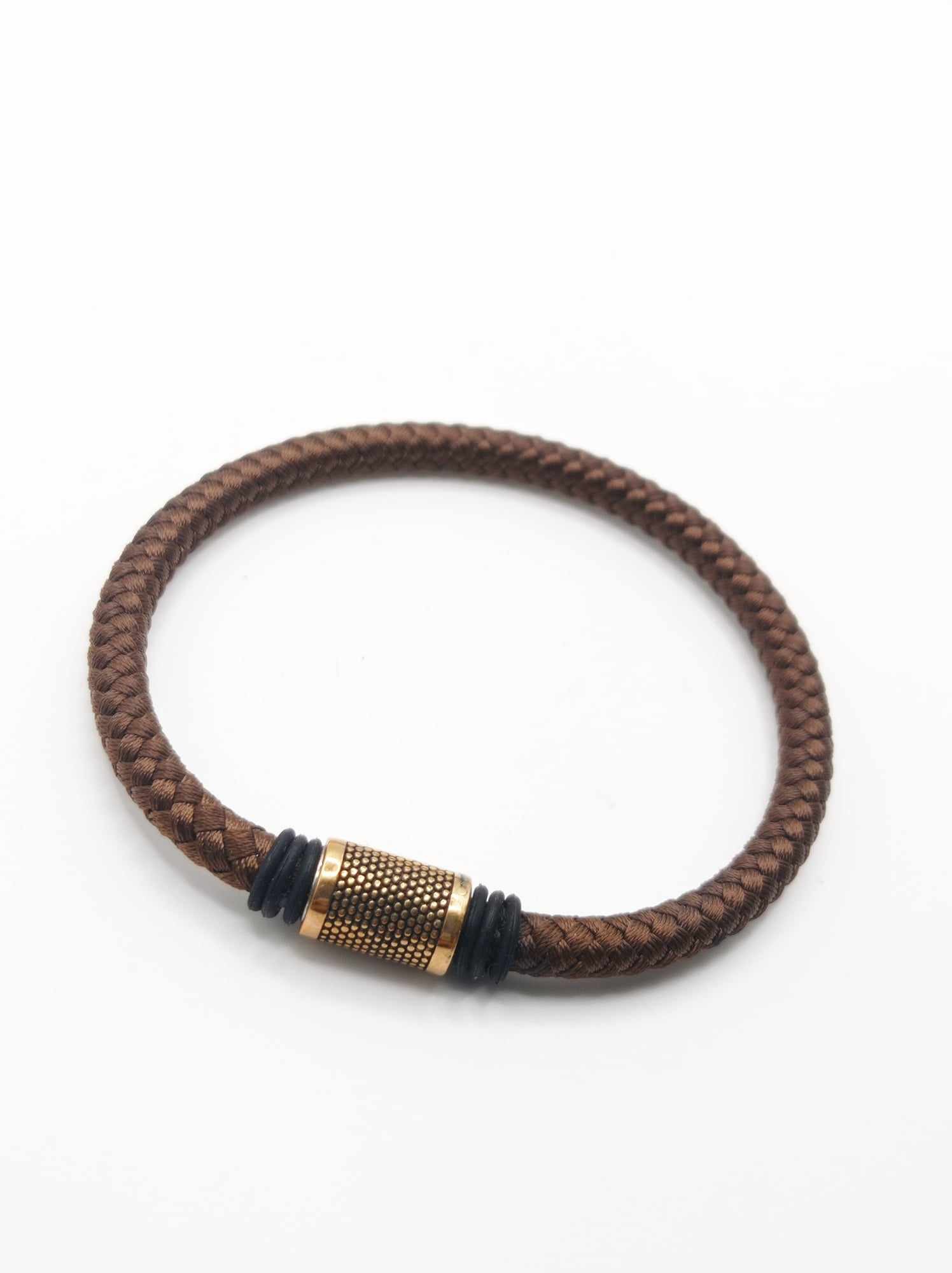 Bracciale unisex Lorenz gioielli in cordino intrecciato marrone e chiusura in acciaio color oro calamitata.