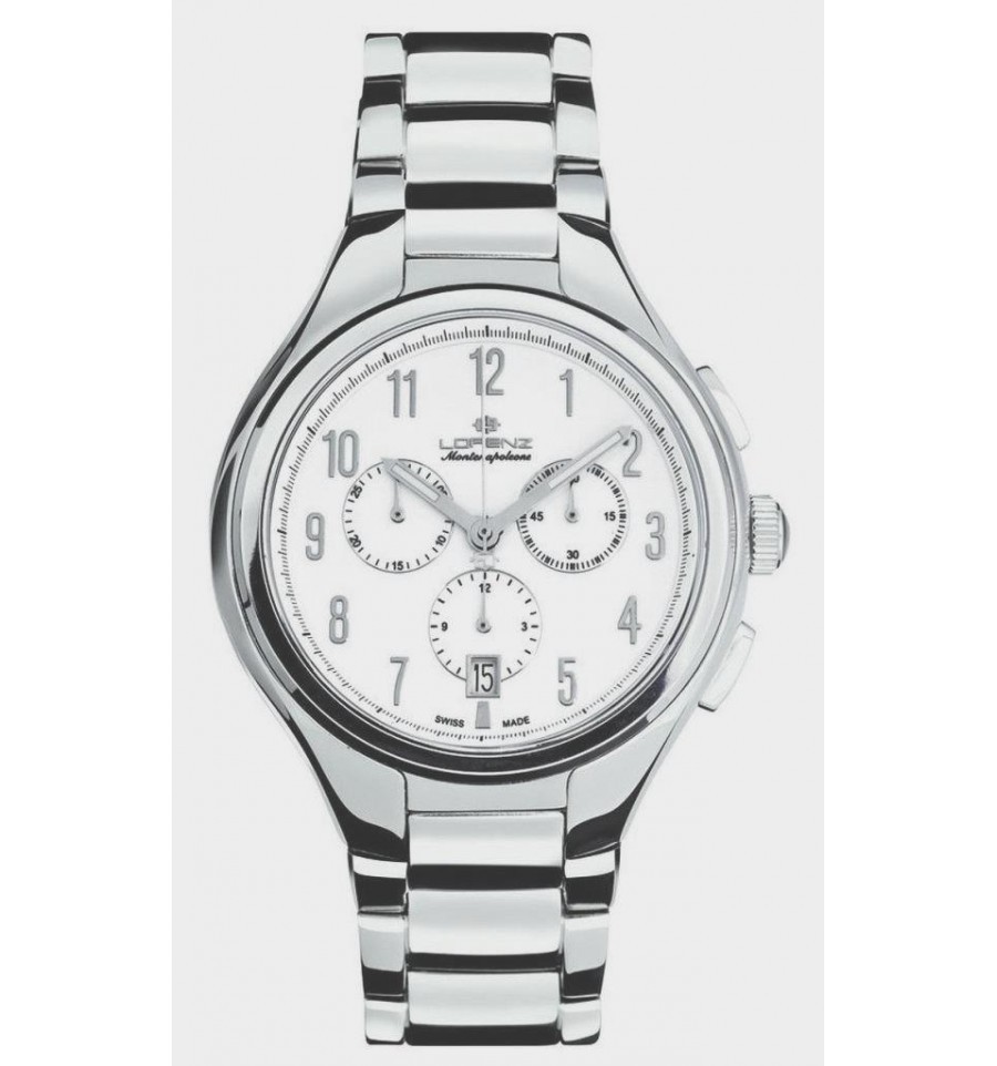 Orologio uomo cronografo con movimento a quarzo (Swiss Made), datario, cinturino in acciaio e cassa rotonda collezione Montenapoleone Lorenz. L'orologio Lorenz si presenta con cinturino in acciaio e chiusura a deploiante con pulsanti laterali di sicurezza. Il quadrante rotondo è di colore bianco con datario posizionato a ore 6. Gli indici a numeri arabi sono di colore argento, mentre le lancette sono a bastone di colore argento/ bianco. I contatori del cronografo sono posizionati a ore 3, 6, 9. L'orologio è impermeabile all'acqua fino a 5 Atm (50 Metri).