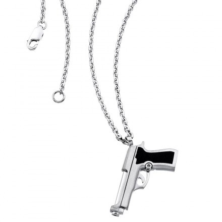 Collana in argento e pendente a forma di pistola M9 sempre in argento con il calcio smaltato di nero.